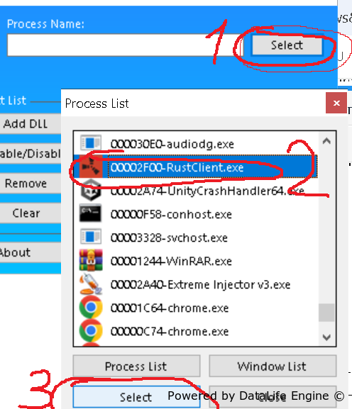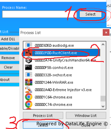 В окне Process Name выбираем из списка наш процесс запущеного rust client и нажимаем select применить